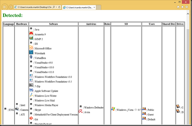 Como conclusión para IExplorer y Firefox se puede decir según las imágenes que es posible determinar: el lenguaje del sistema, el hardware en base al software instalado, software instalado, antivirus, sistema operativo, por fuerza bruta usuarios en el sistema, directorios compartidos, unidades de disco, etc.
