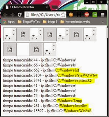 En el siguiente ejemplo se apunta a cinco directorios que no existen y a seis que si, como se puede apreciar los que si existen y que además tienen gran cantidad de elementos tardan mucho más en llamar al evento onLoad que va a servir para calcular el tiempo entre la creación del iframe y el final de la cargar del recurso.