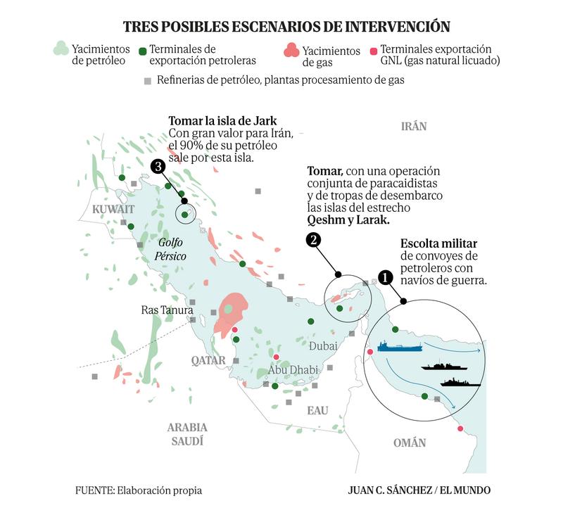 Además, EEUU ha movilizado a una brigada completa (unos 3.000 paracaidistas) de la 82 división aerotransportada, que ya duermen en Jordania y que es conocida por haber sido lanzada sobre Normandía la noche previa al día D en 1944. Esto ofrece alguna pista sobre los planes que maneja el Pentágono para tomar algún objetivo valioso en la región, ya sea la isla de Jark, en el interior del Golfo, que sirve de centro exportador del 90% del petróleo iraní, o las estratégicas islas del Estrecho de Ormuz, en especial Qeshm y Larak, islas cuyas dimensiones coinciden, por cierto, con Okinawa e Iwo Jima, dos islas del Pacífico cuya conquista por parte de los Marines resultó sangrienta.