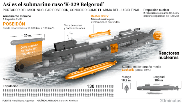 Ya el pasado mes de enero, la también agencia de noticias Tass informó, citando una fuente de la industria militar rusa, que se había "fabricado un primer lote de drones submarinos con capacidad nuclear Poseidón para el submarino de propulsión nuclear especial Belgorod" y que pronto estarían operativos en este submarino.